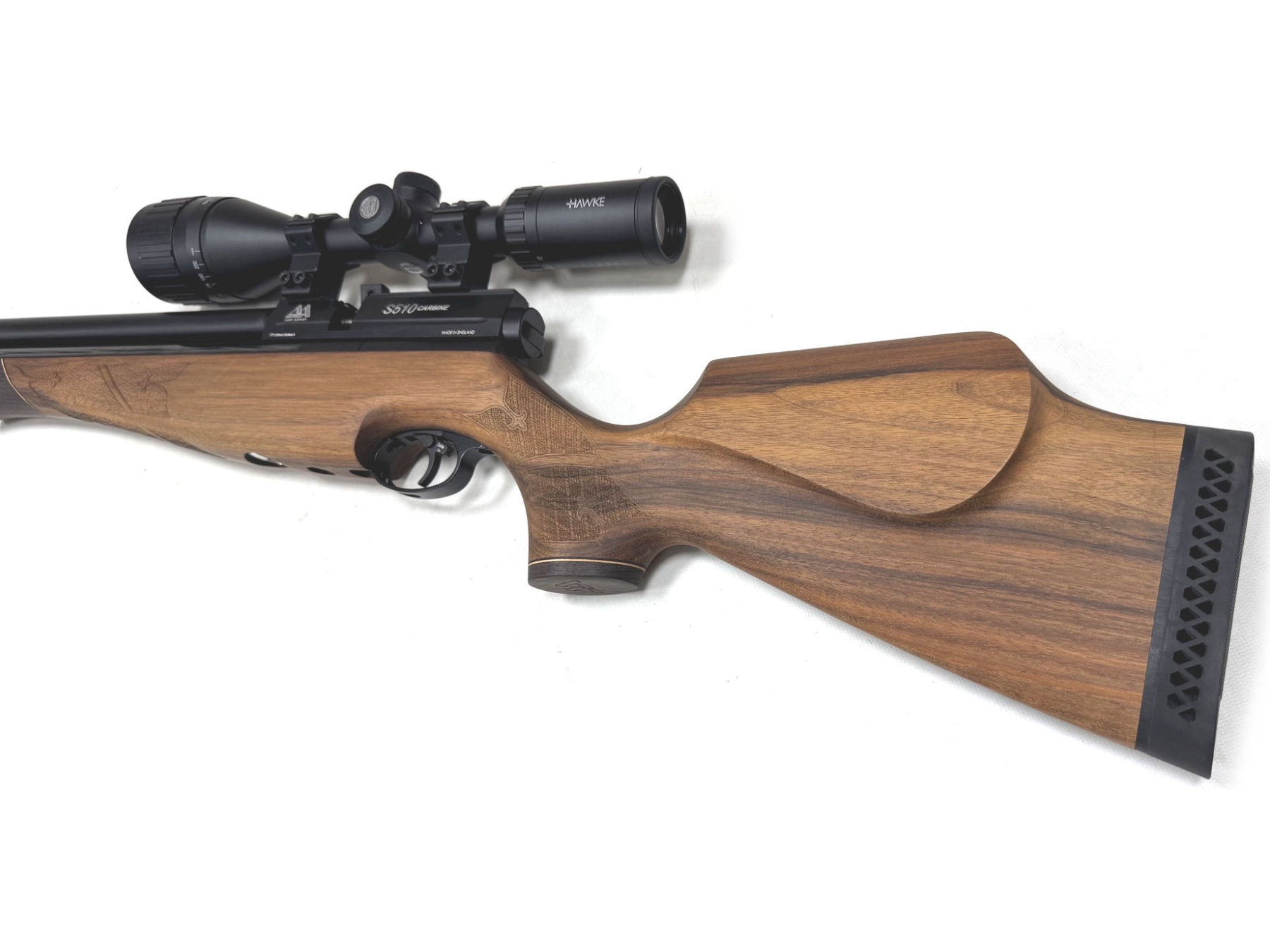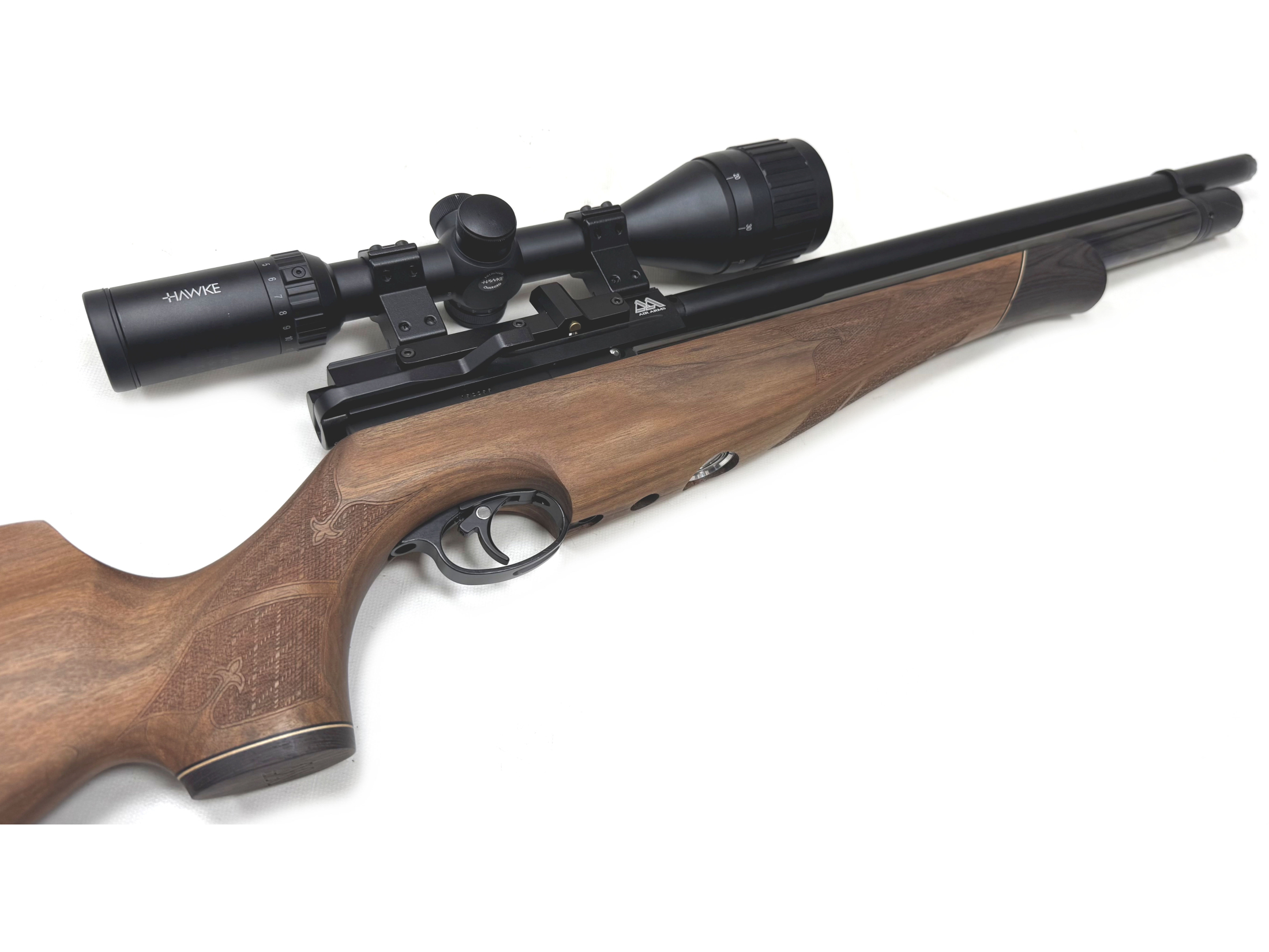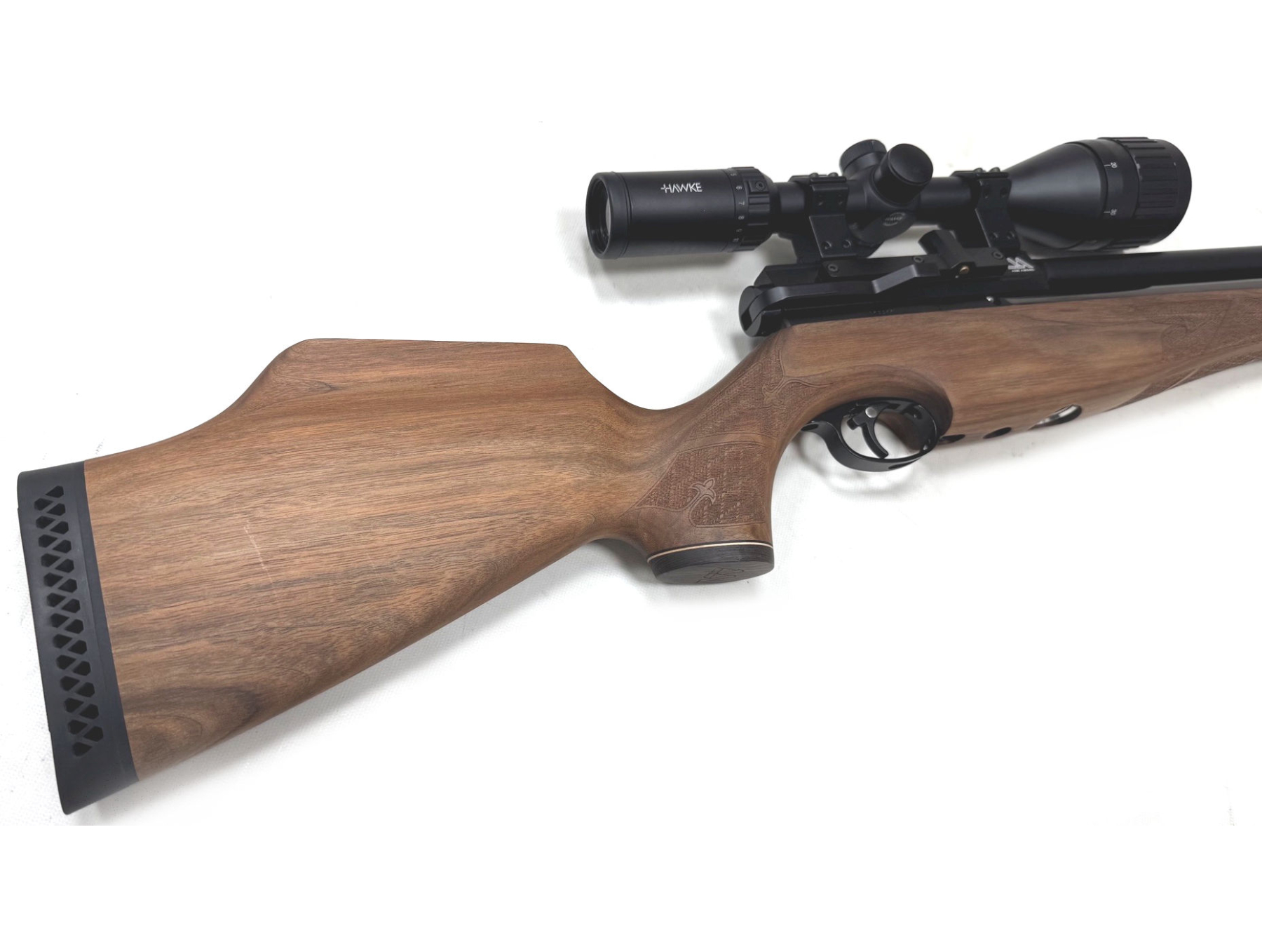 Chronographed at 11.3 ft/lbs with QYS Domed 8.48gr pellets. Supplied complete with Hawke Fast Mount 3-12x50 AO IR scope, one magazine, filler probe and manual.
